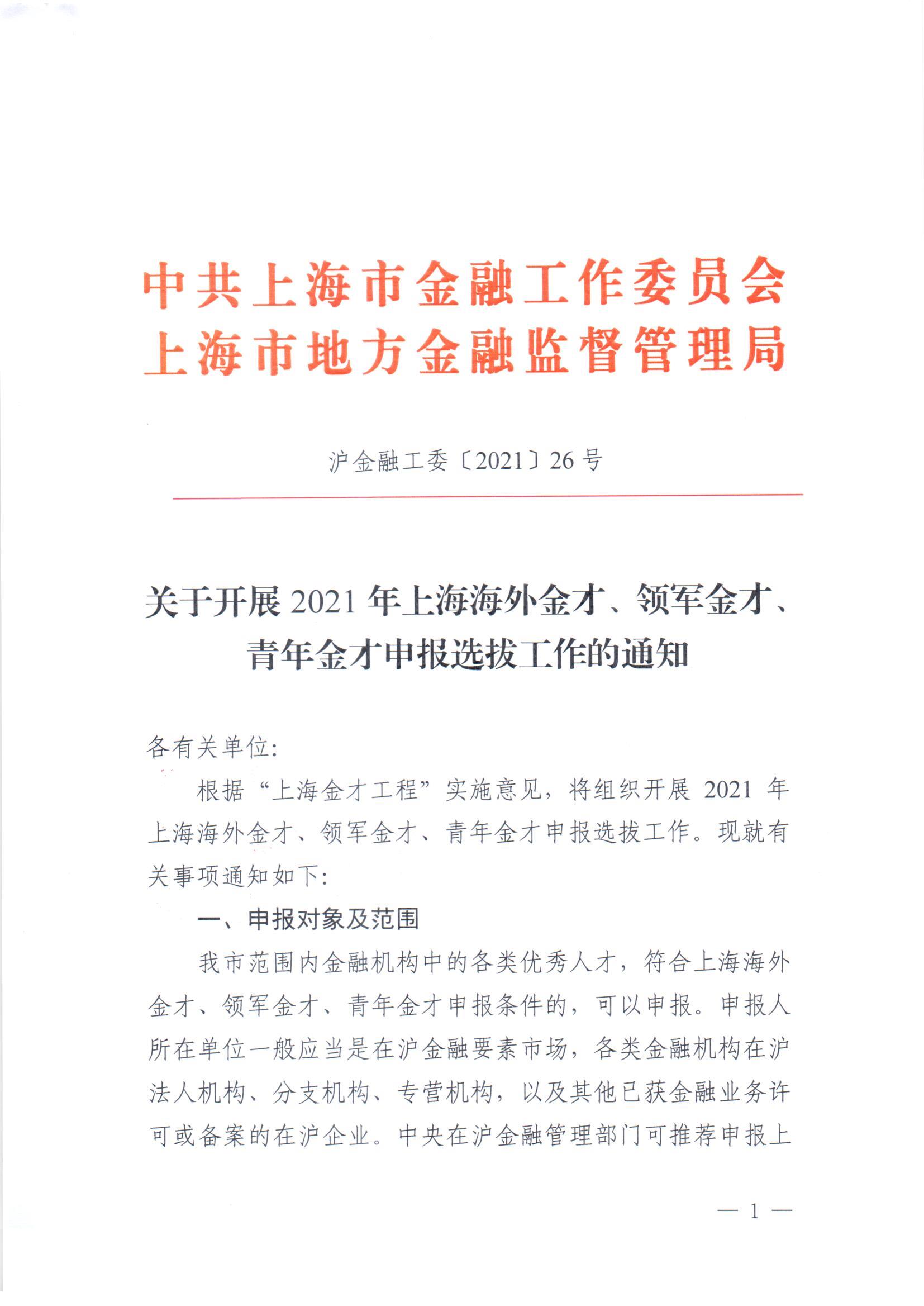 關于開展2021年上海海外金才、領軍金才、青年金才申報選拔工作的通知
