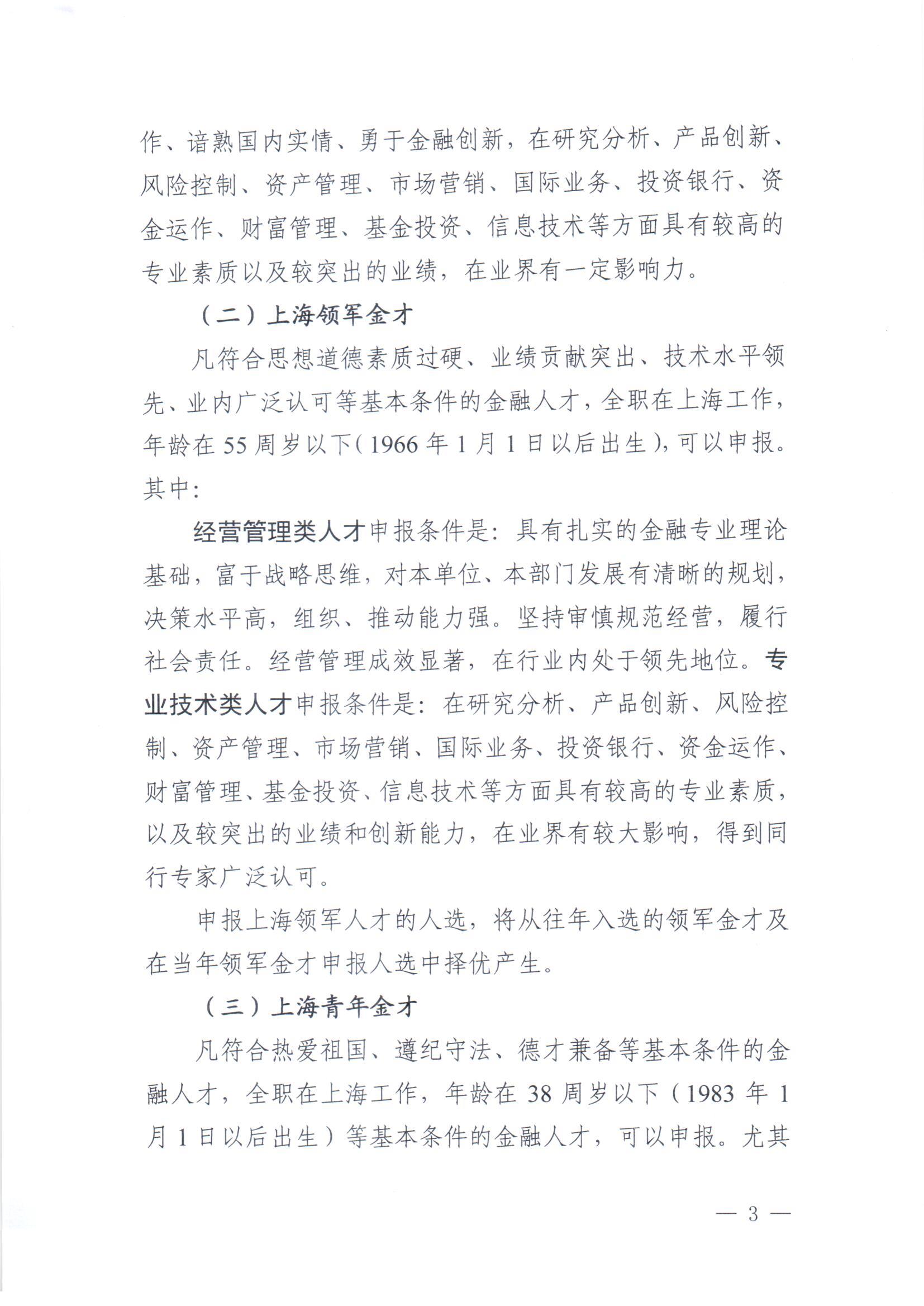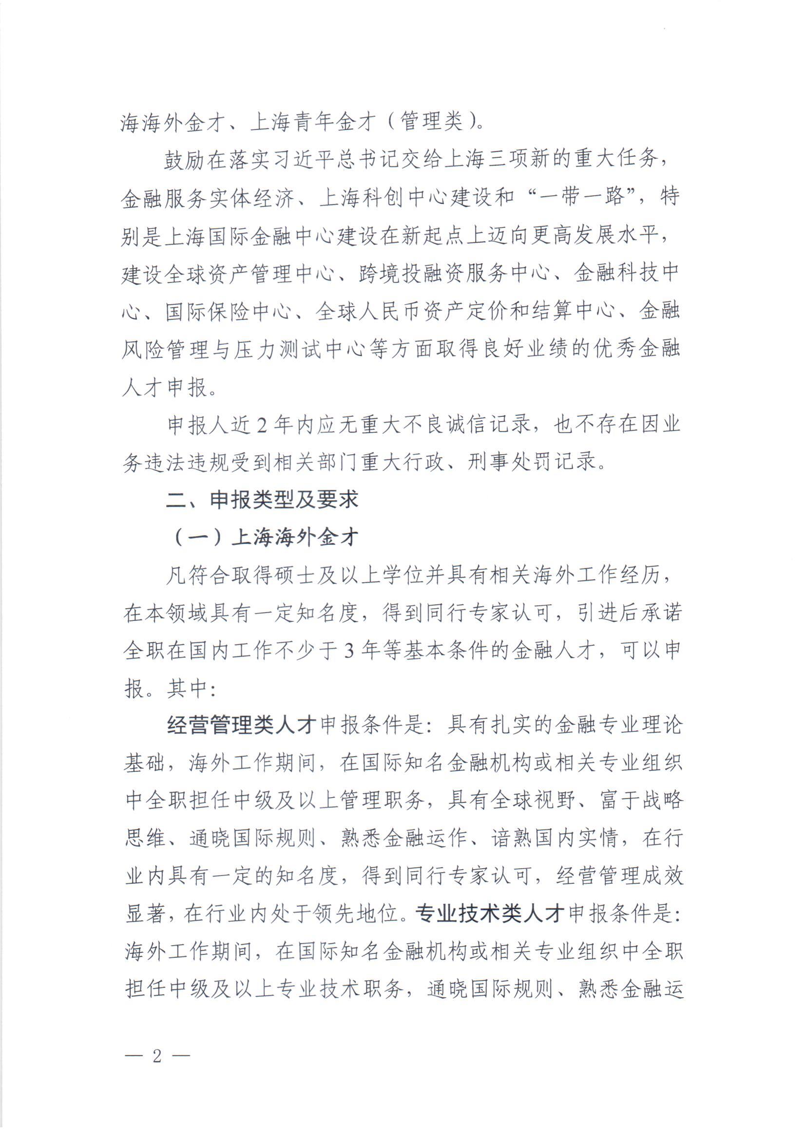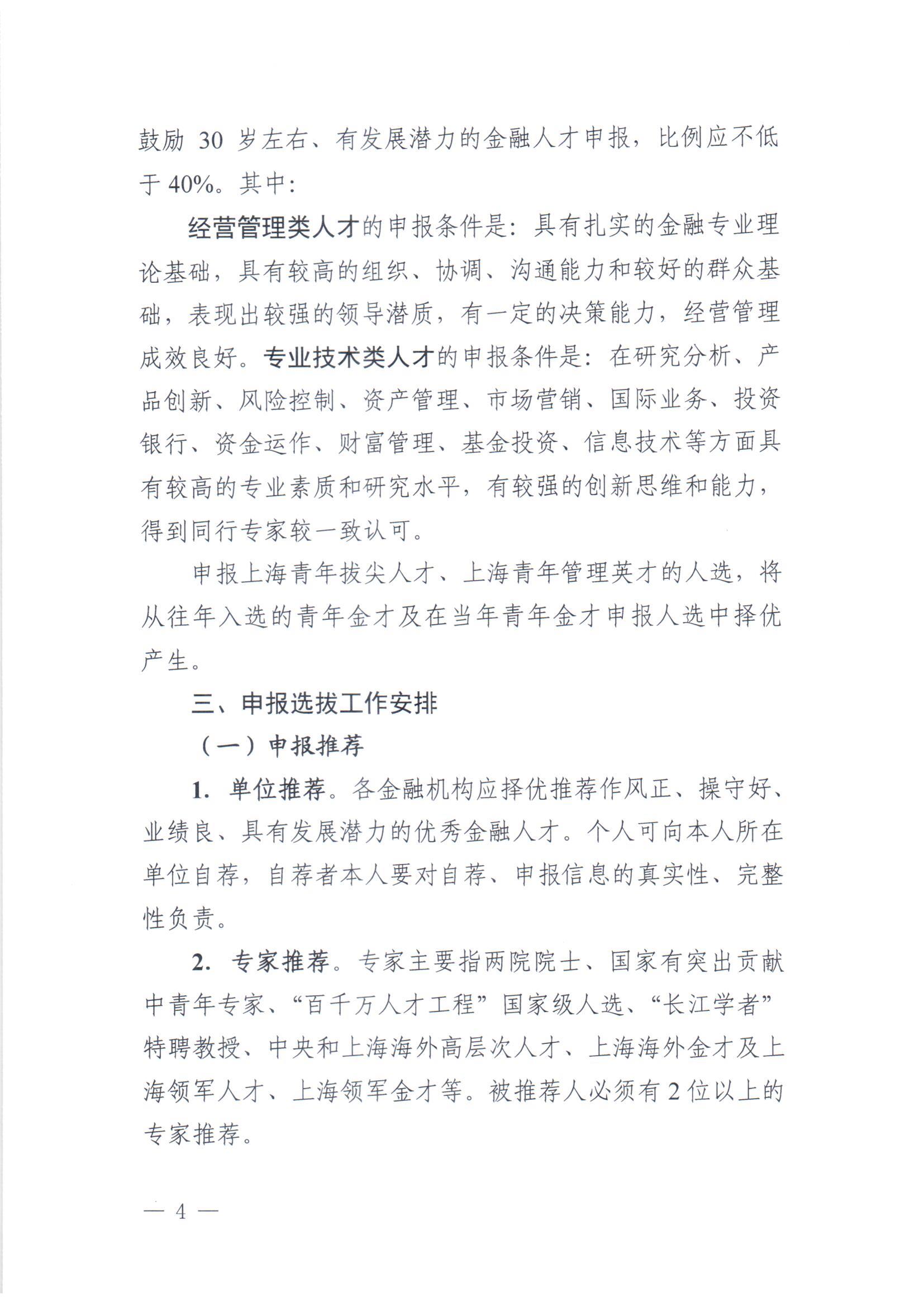 2021年可申報對象原則上為持牌金融機構中的金融人才,突出國際化、年輕化、復合型,海外金才更加聚焦具有海外工作經(jīng)歷、勇于金融創(chuàng)新的金融人才,領軍金才更加聚焦專業(yè)集成、行業(yè)融合、團隊效應突出的金融人才,青年金才更加聚焦30歲左右、已經(jīng)嶄露頭角、有發(fā)展?jié)摿Φ哪贻p金融人才。積極鼓勵在落實習近平總書記交給上海的三項新的重大任務,服務“一帶一路”建設、上海國際金融中心建設和科創(chuàng)中心建設等國家戰(zhàn)略,服務上海建設全球資產(chǎn)管理中心、跨境投融資服務中心、金融科技中心、國際保險中心、全球人民幣資產(chǎn)定價和結算中心、金融風險管理與壓力測試中心等六個中心建設方面取得良好業(yè)績的金融人才申報。其中,將重點關注金融服務實體經(jīng)濟、全面支持創(chuàng)新發(fā)展,以及統(tǒng)籌推動金融高水平制度性開放與防范化解金融風險等方面做出重要貢獻的優(yōu)秀金融人才。申報工作截止日期為6月18日,完成申報后,將經(jīng)過網(wǎng)上和現(xiàn)場兩輪評審、征求意見、名單公示和討論決定等環(huán)節(jié),于10月左右正式公布入選名單。