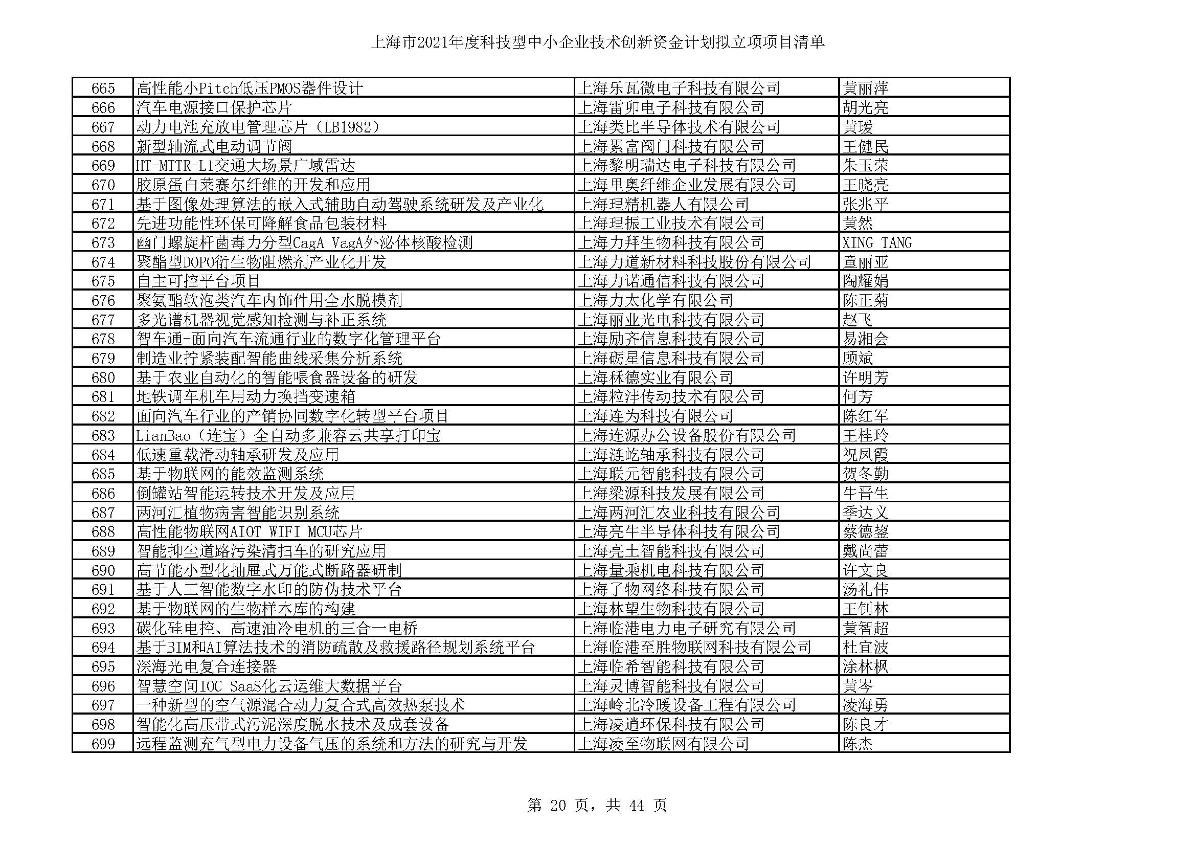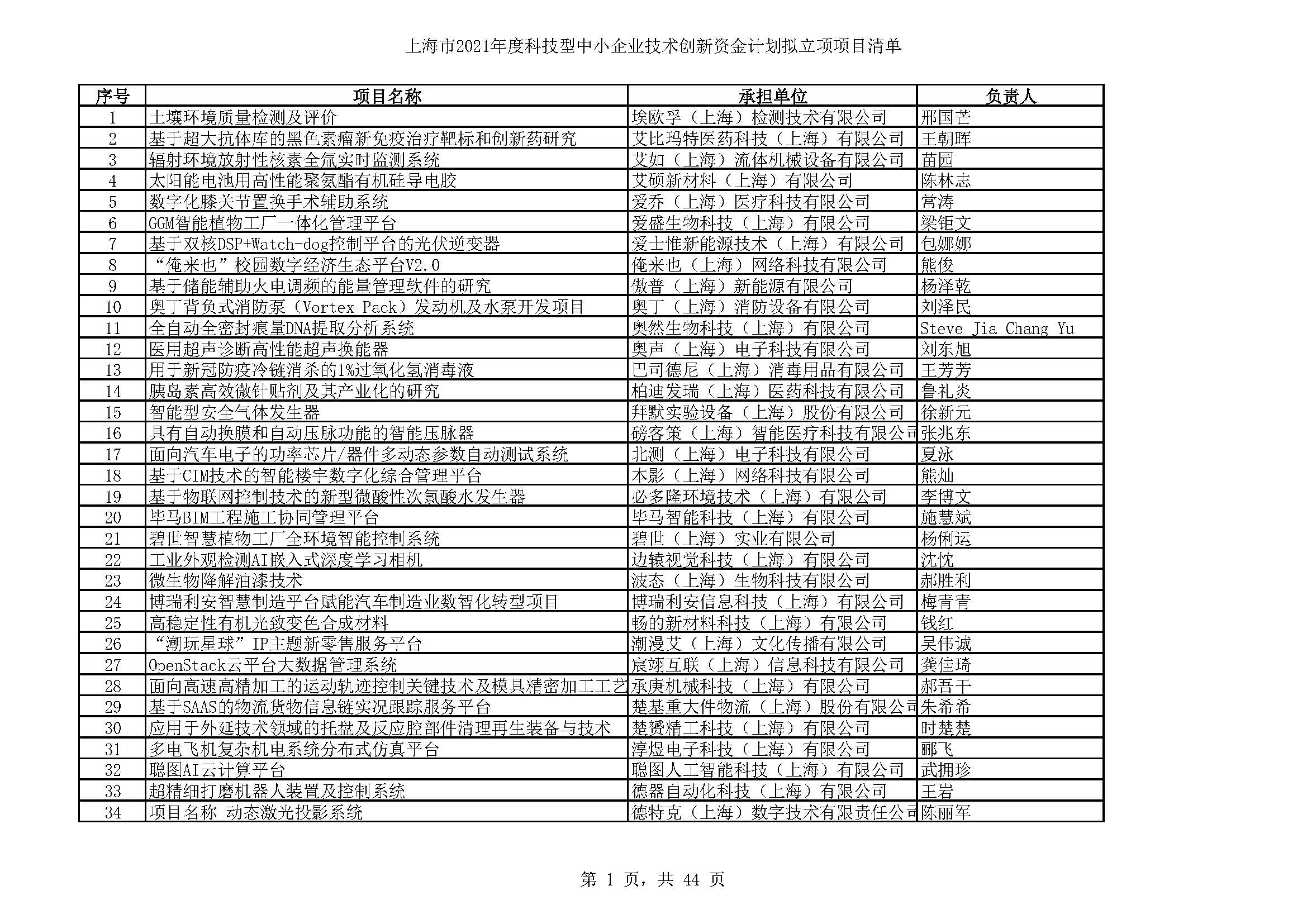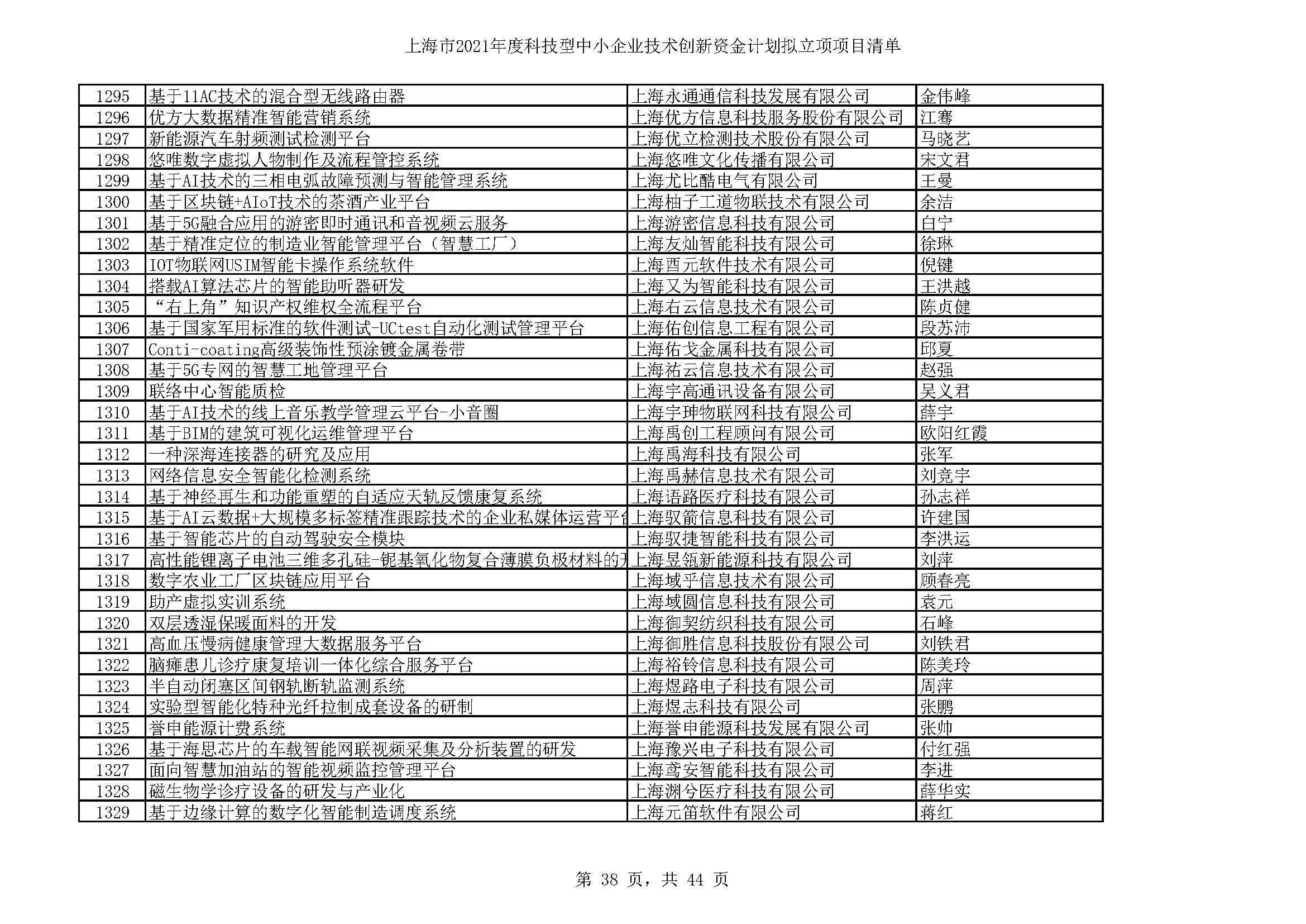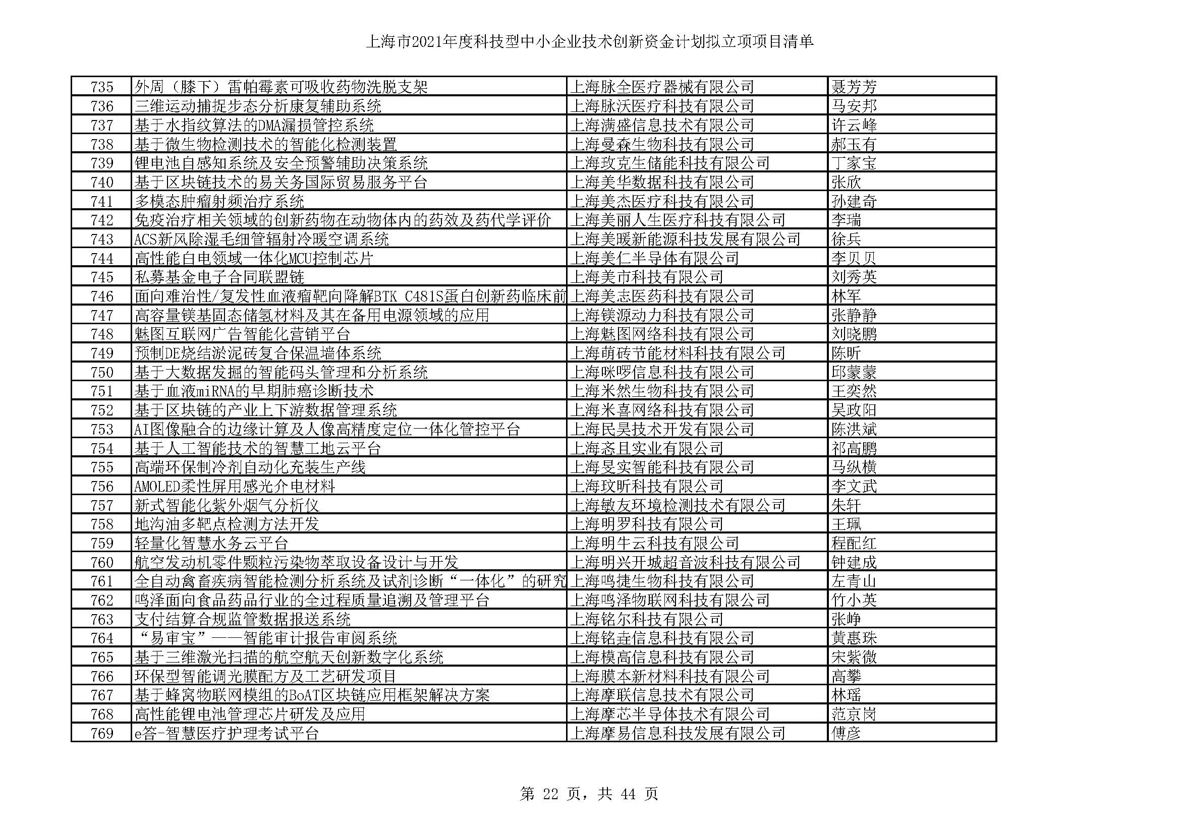 根據(jù)《中共中央辦公廳、國(guó)務(wù)院辦公廳關(guān)于深化項(xiàng)目評(píng)審、人才評(píng)價(jià)、機(jī)構(gòu)評(píng)估改革的意見(jiàn)》等文件要求, 現(xiàn)將上海市2021年度科技型中小企業(yè)技術(shù)創(chuàng)新資金計(jì)劃擬立項(xiàng)項(xiàng)目予以公示。