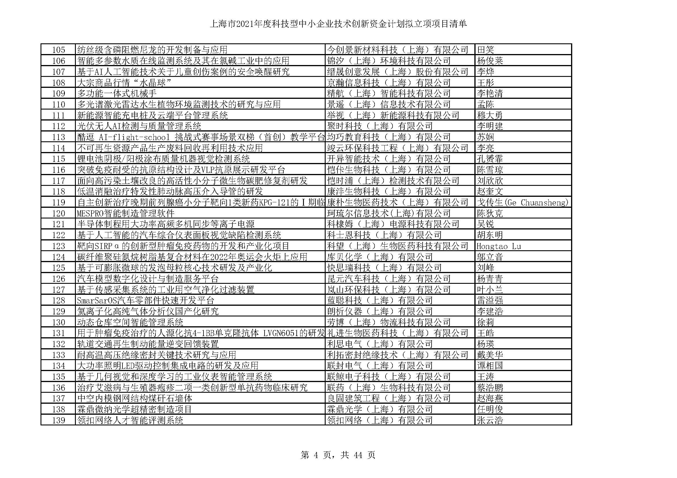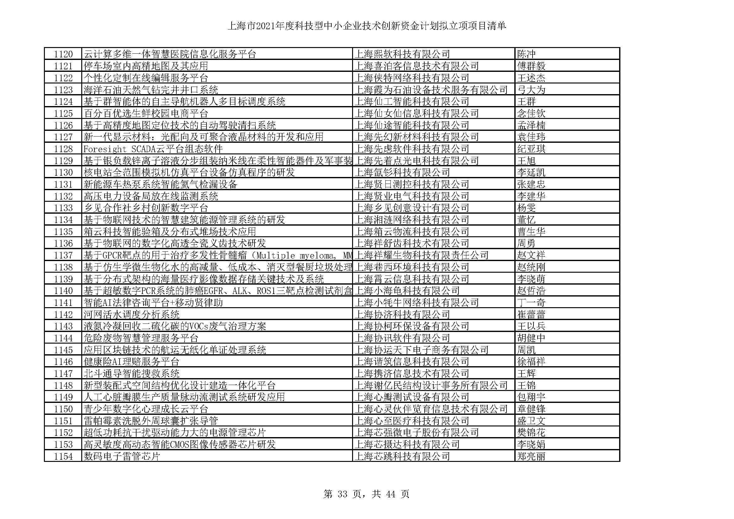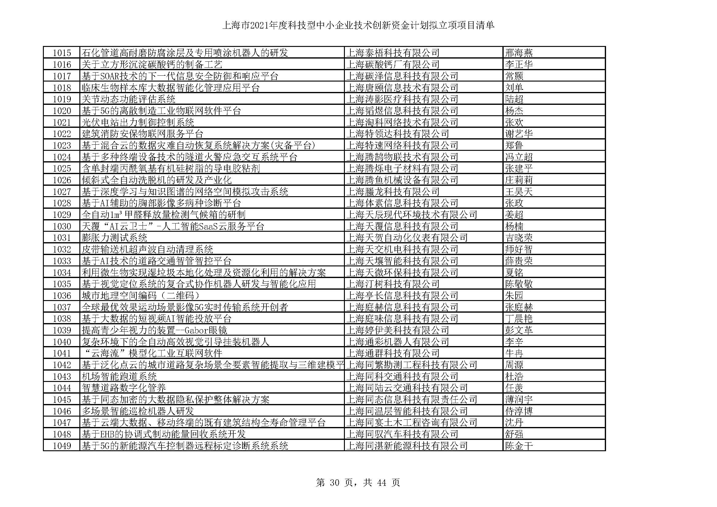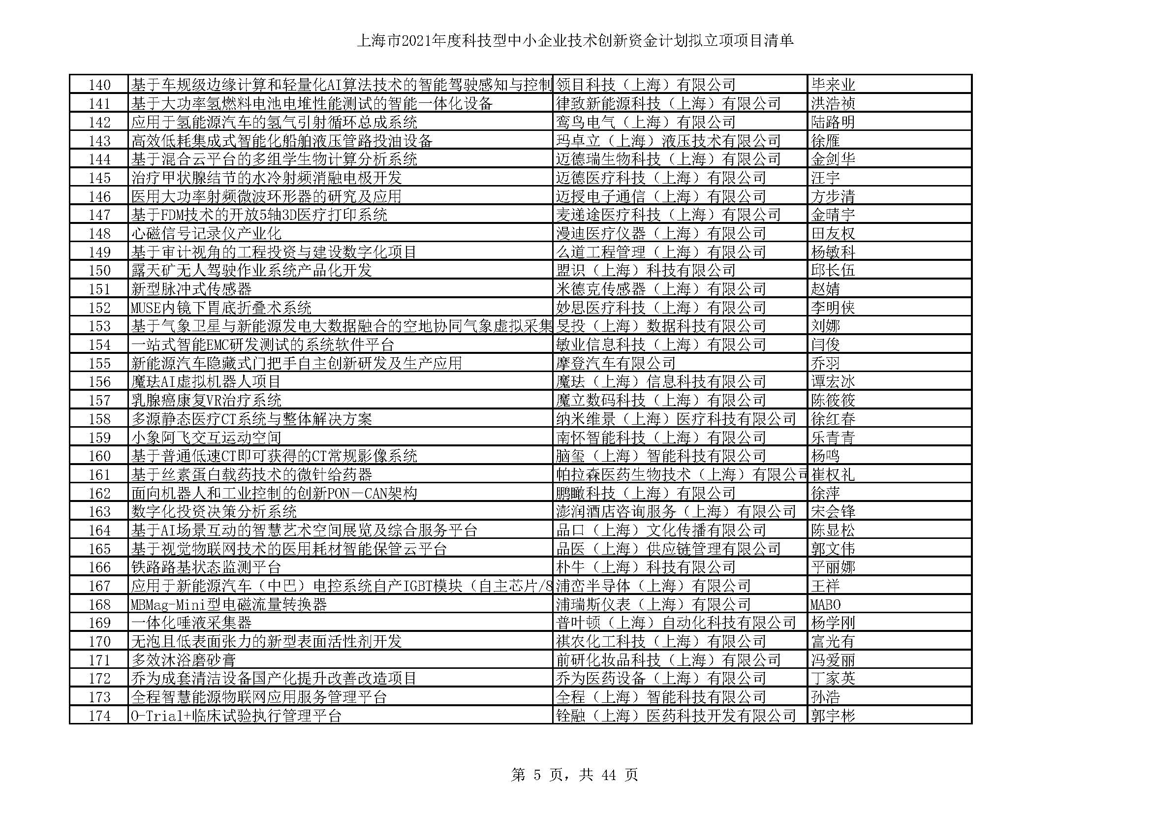根據(jù)《中共中央辦公廳、國(guó)務(wù)院辦公廳關(guān)于深化項(xiàng)目評(píng)審、人才評(píng)價(jià)、機(jī)構(gòu)評(píng)估改革的意見(jiàn)》等文件要求, 現(xiàn)將上海市2021年度科技型中小企業(yè)技術(shù)創(chuàng)新資金計(jì)劃擬立項(xiàng)項(xiàng)目予以公示。