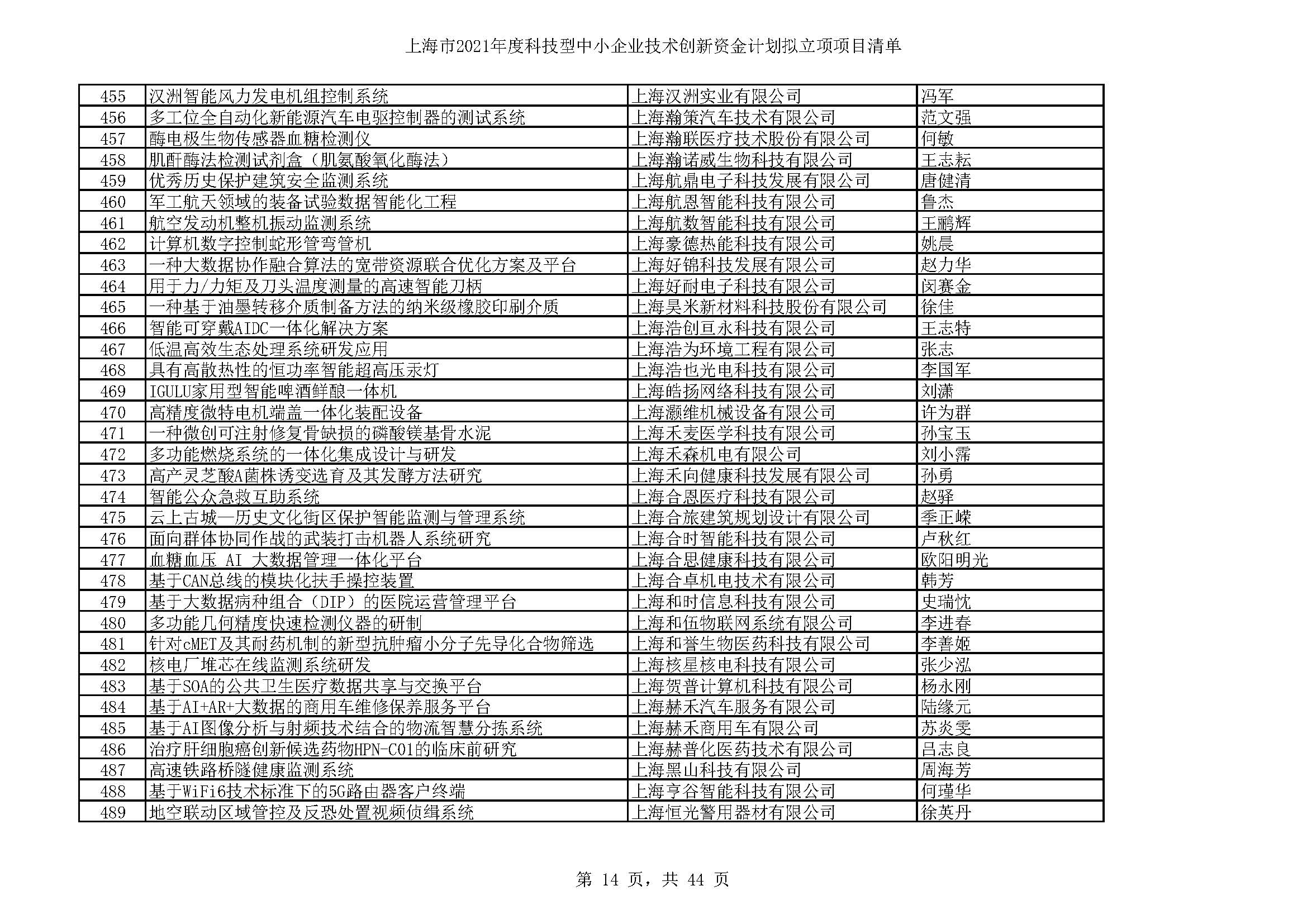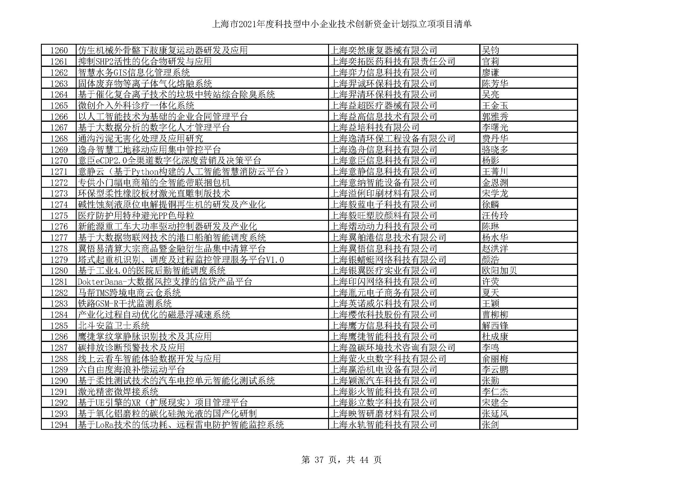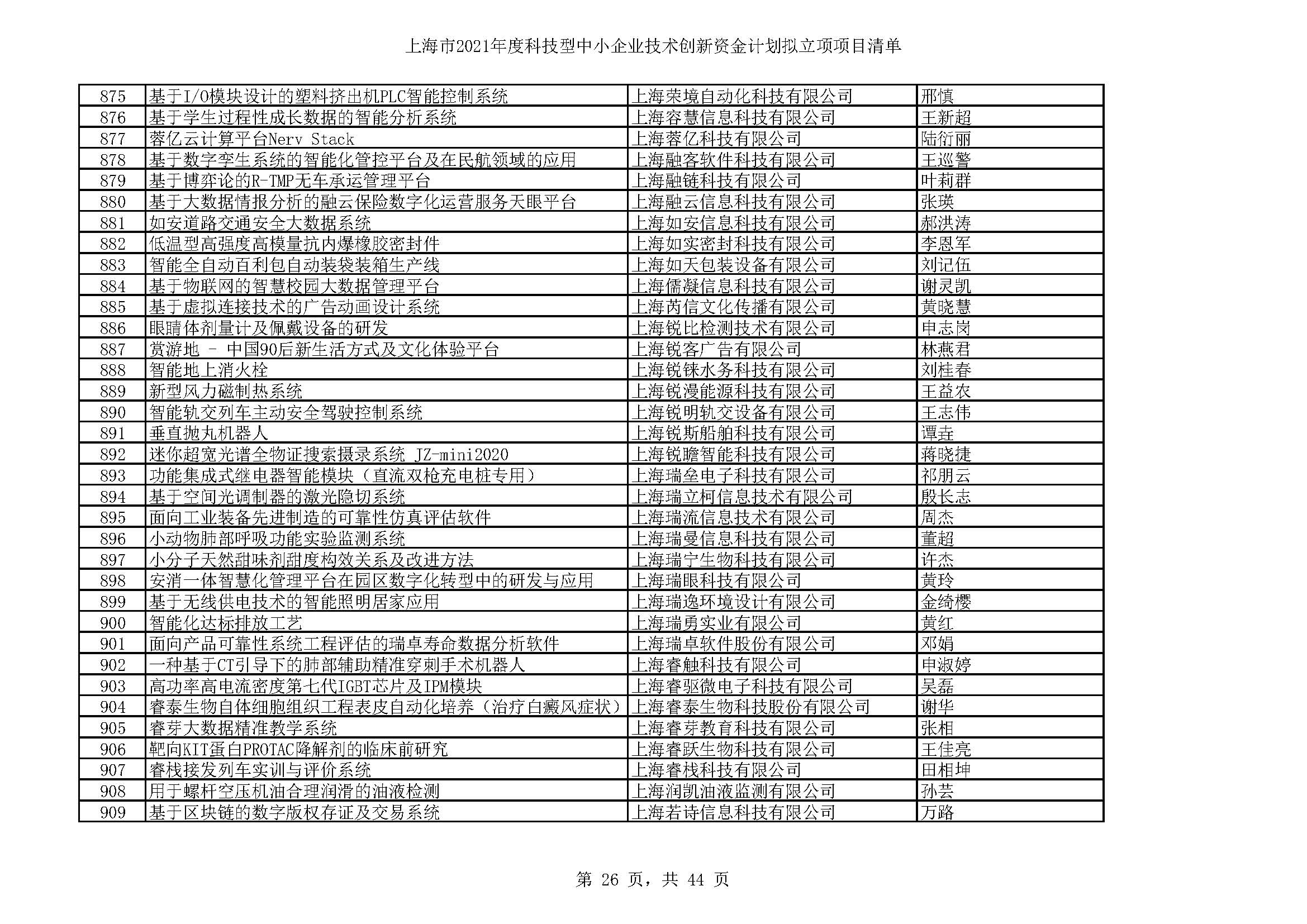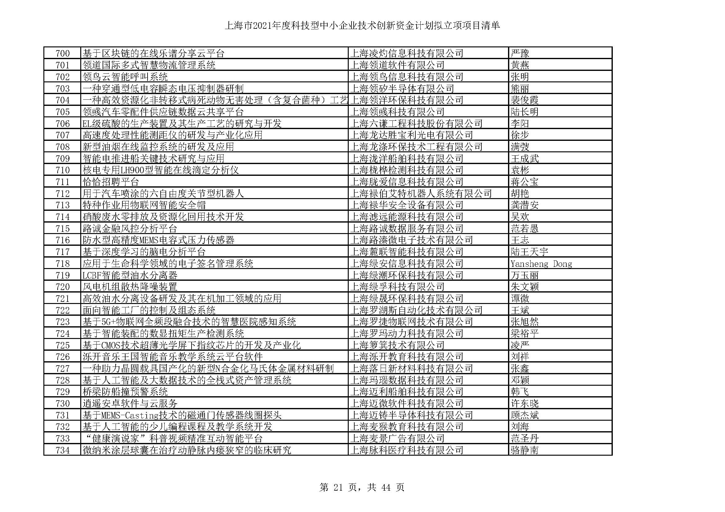 上海市2021年度科技型中小企業(yè)技術(shù)創(chuàng)新資金計(jì)劃擬立項(xiàng)項(xiàng)目公示的通知