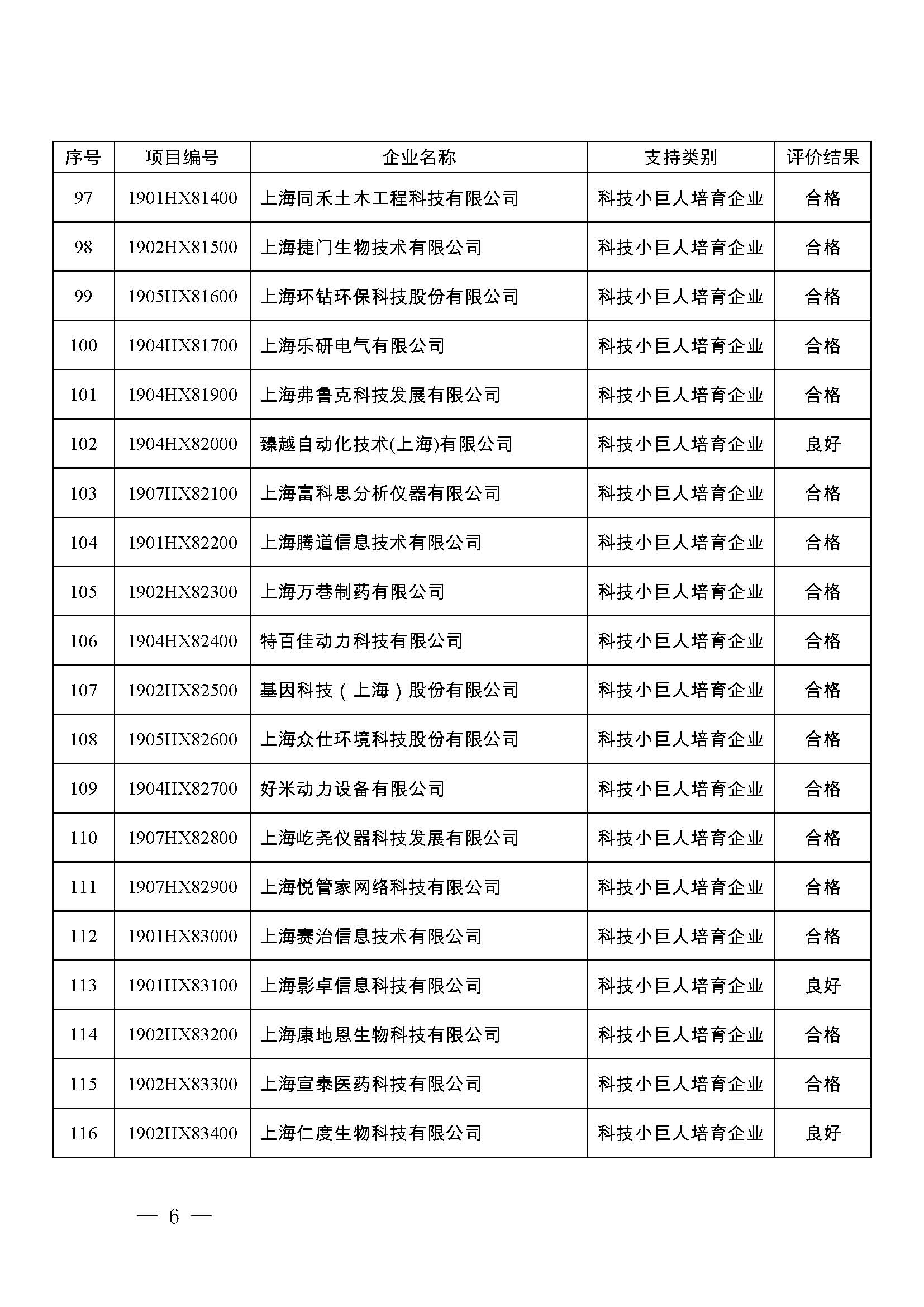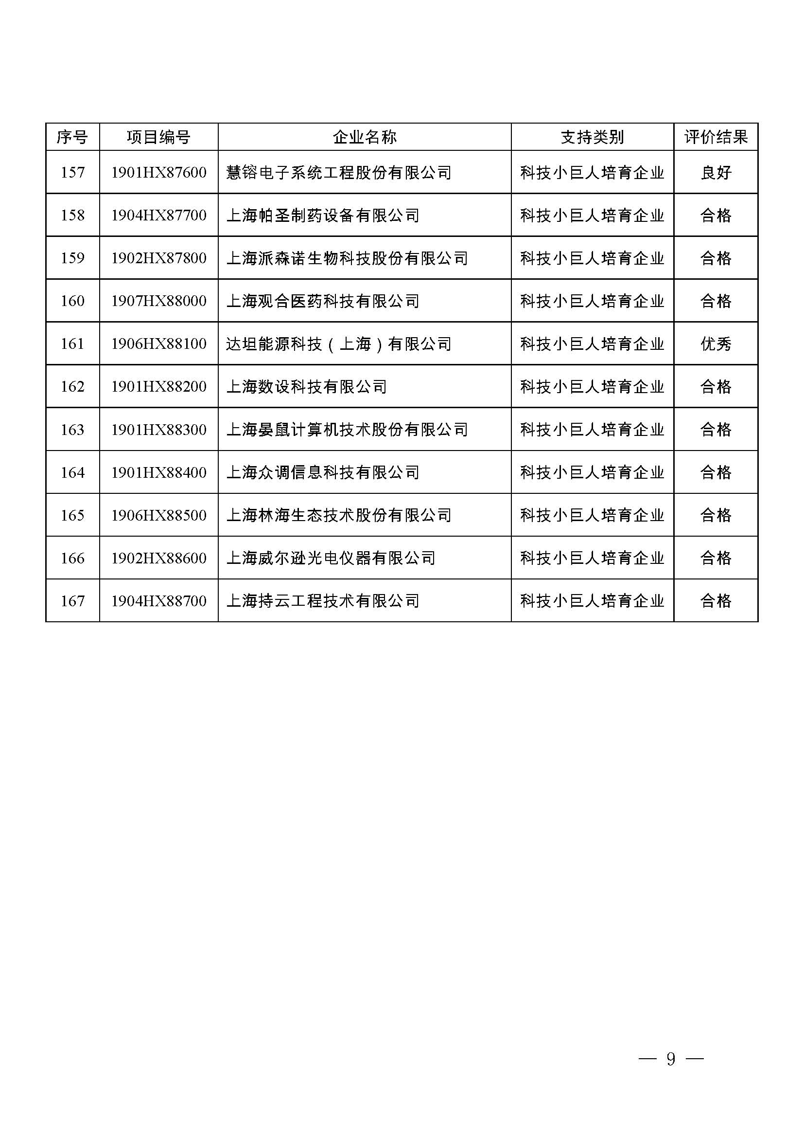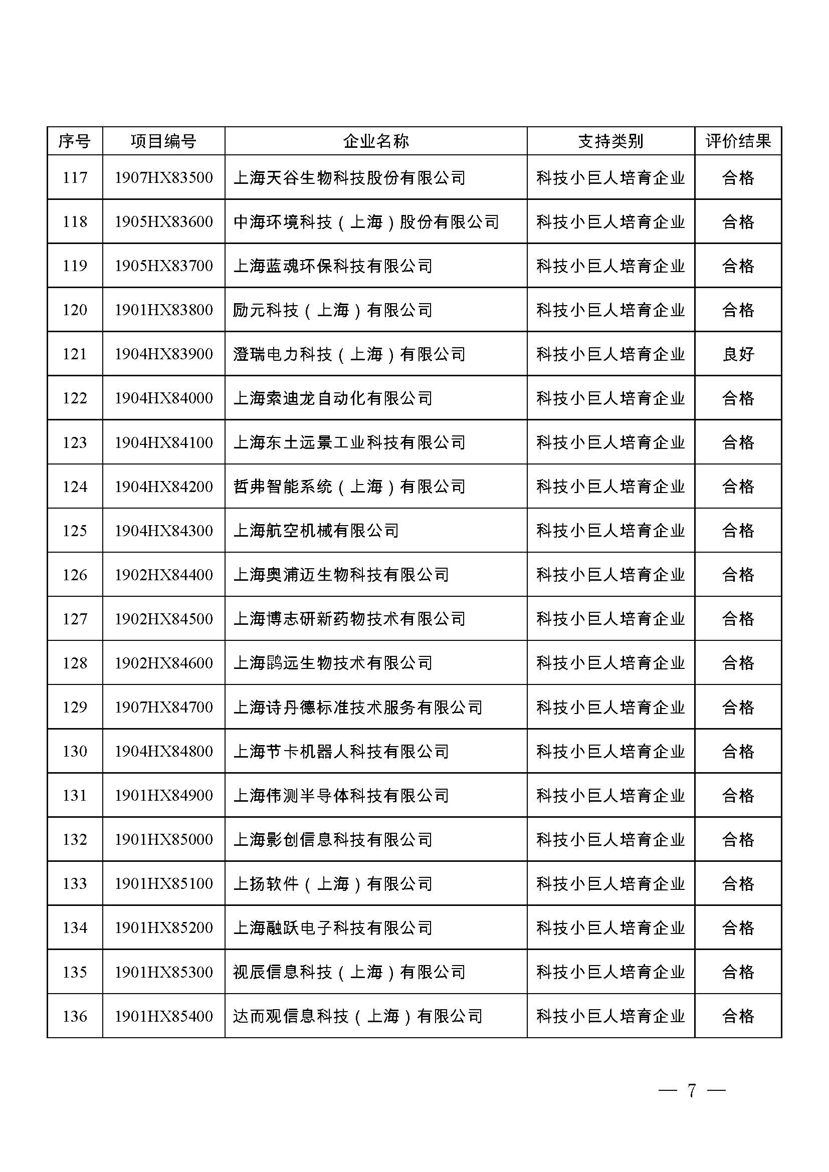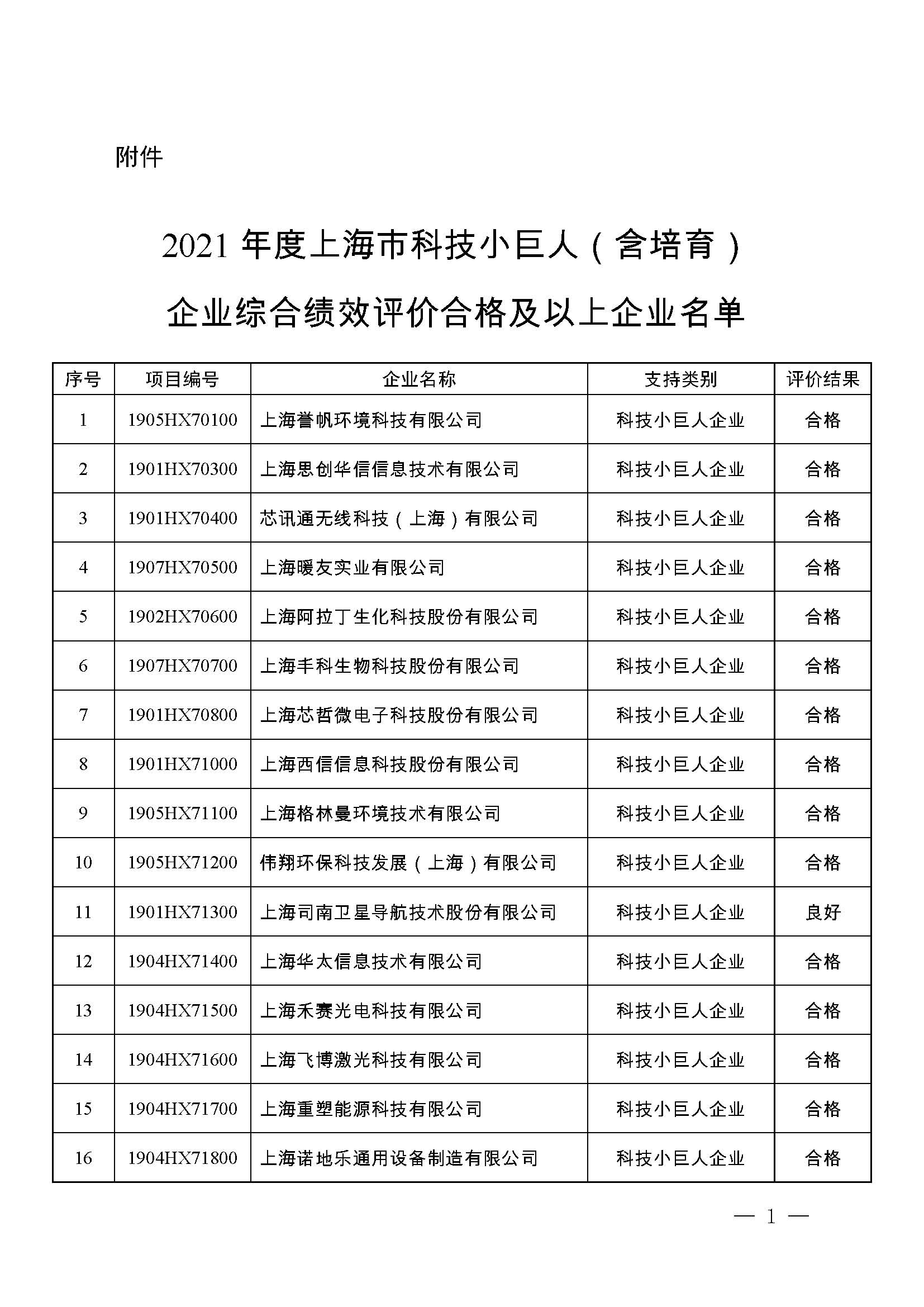 根據(jù)《關(guān)于開展2021年度上海市科技小巨人(含培育)企業(yè)綜合績效評(píng)價(jià)工作的通知》(滬科〔2021〕3號(hào))要求,經(jīng)自主申報(bào)、綜合績效評(píng)價(jià),“上海神開石油科技有限公司”等5家科技小巨人(含培育)企業(yè)評(píng)估為“優(yōu)秀”,“上海司南衛(wèi)星導(dǎo)航技術(shù)股份有限公司”等14家科技小巨人(含培育)企業(yè)評(píng)估為“良好”,“上海譽(yù)帆環(huán)境科技有限公司”等148家科技小巨人(含培育)企業(yè)評(píng)估為“合格”,7家科技小巨人(含培育)企業(yè)評(píng)估為“不合格”?,F(xiàn)將綜合績效評(píng)價(jià)合格及以上企業(yè)名單予以公布。