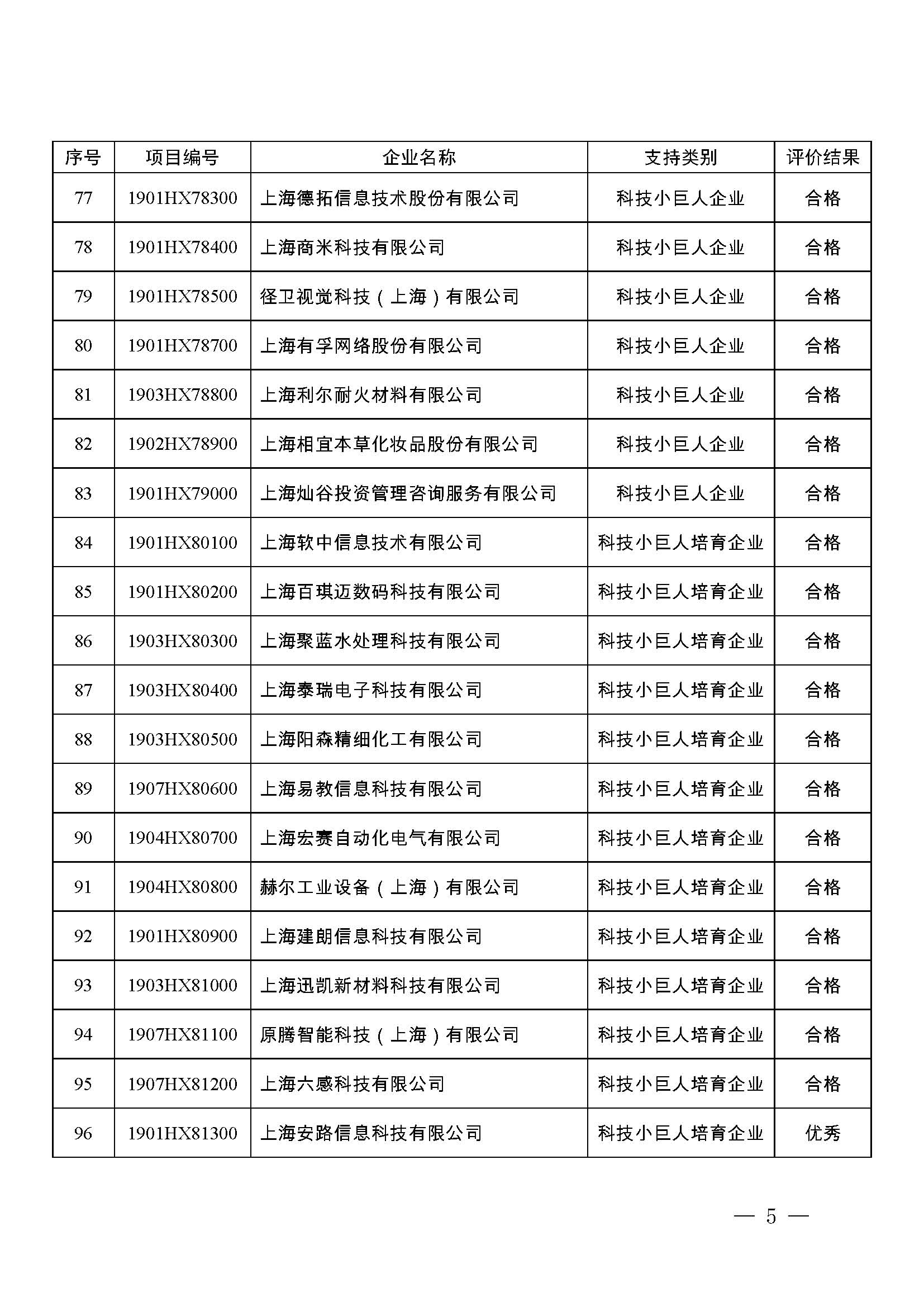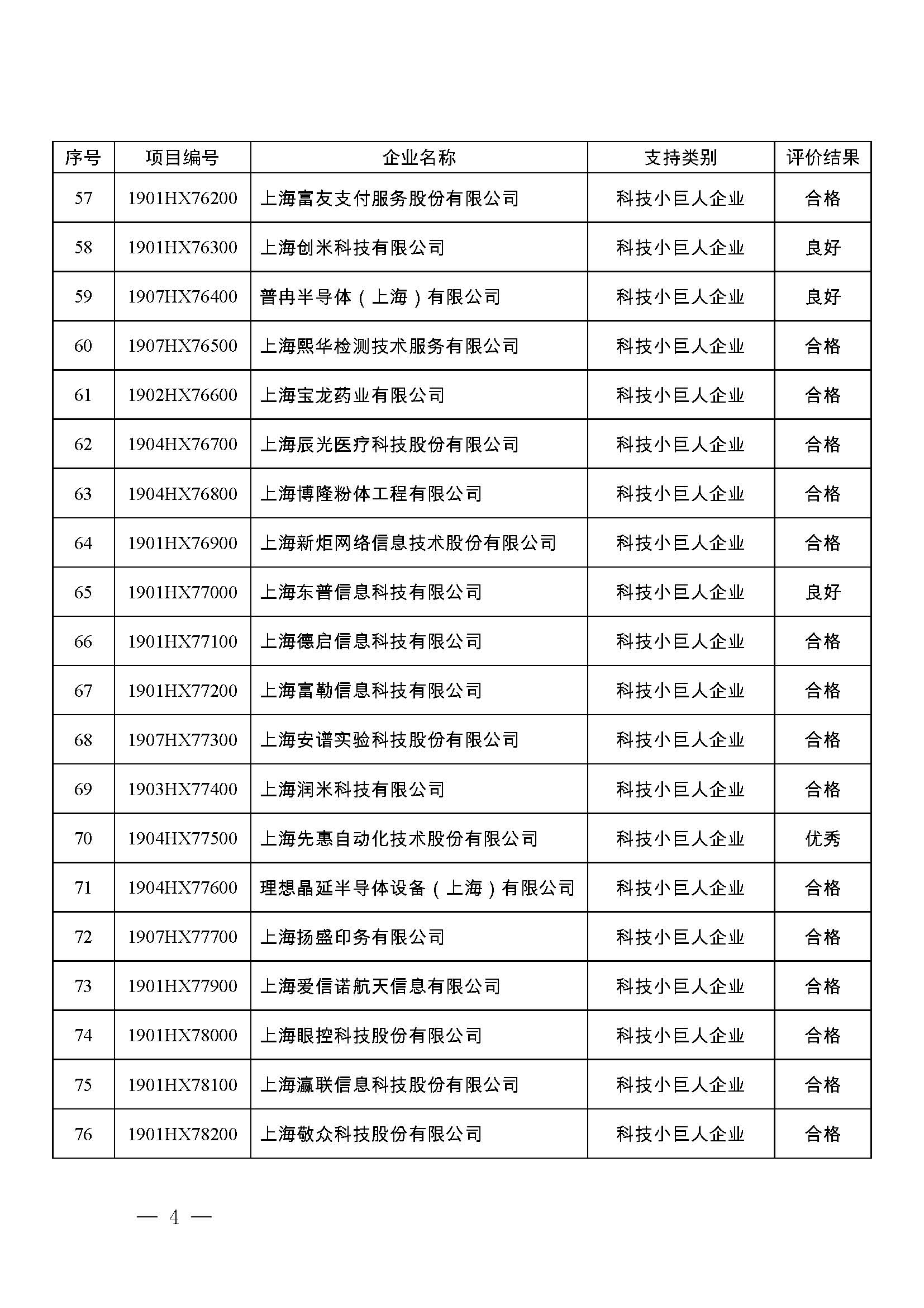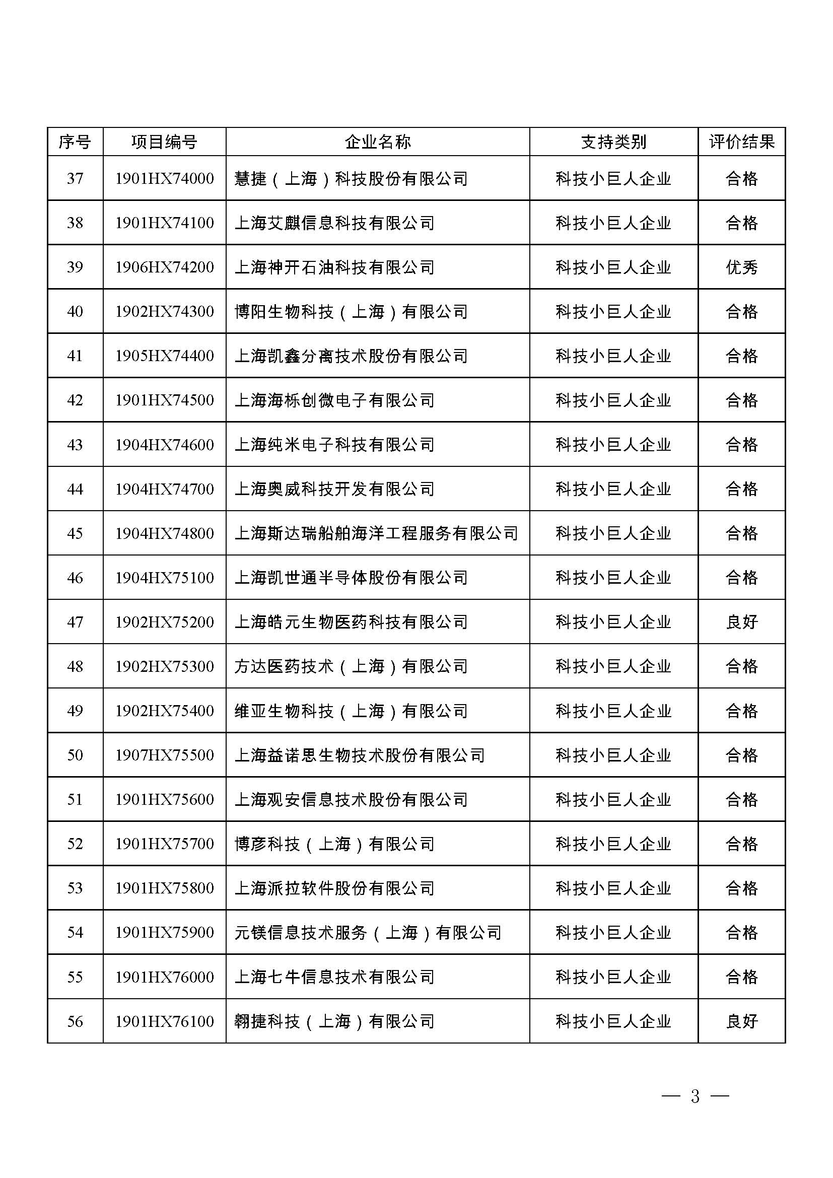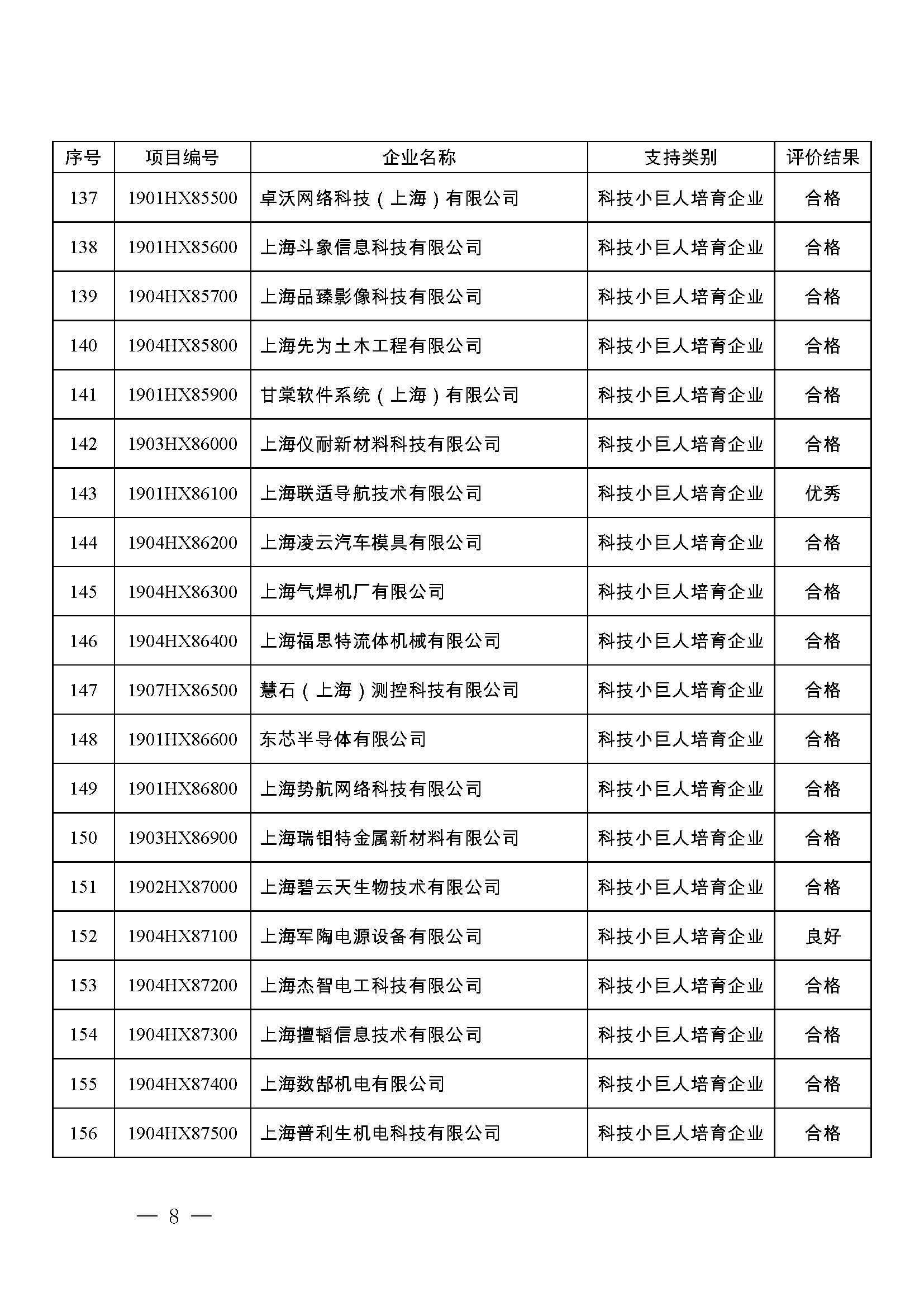 根據(jù)《關(guān)于開展2021年度上海市科技小巨人(含培育)企業(yè)綜合績效評(píng)價(jià)工作的通知》(滬科〔2021〕3號(hào))要求,經(jīng)自主申報(bào)、綜合績效評(píng)價(jià),“上海神開石油科技有限公司”等5家科技小巨人(含培育)企業(yè)評(píng)估為“優(yōu)秀”,“上海司南衛(wèi)星導(dǎo)航技術(shù)股份有限公司”等14家科技小巨人(含培育)企業(yè)評(píng)估為“良好”,“上海譽(yù)帆環(huán)境科技有限公司”等148家科技小巨人(含培育)企業(yè)評(píng)估為“合格”,7家科技小巨人(含培育)企業(yè)評(píng)估為“不合格”?,F(xiàn)將綜合績效評(píng)價(jià)合格及以上企業(yè)名單予以公布。