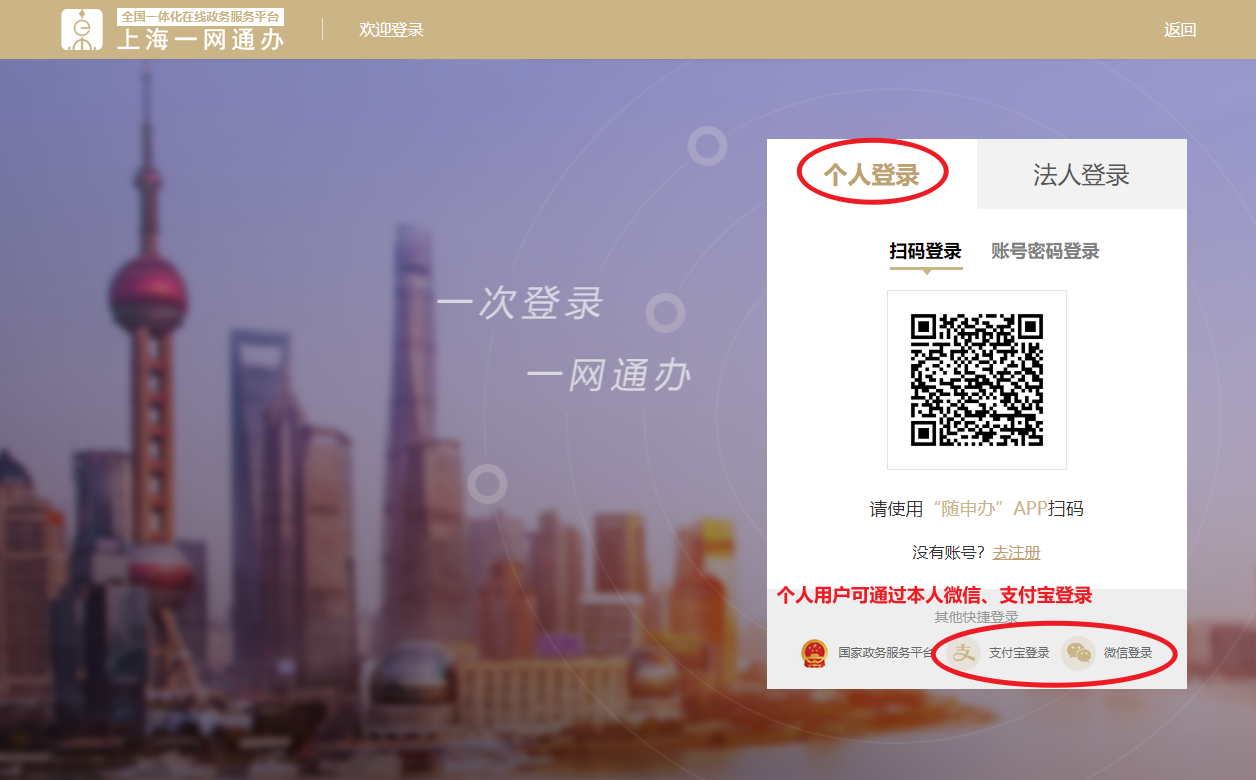 登錄方式:?jiǎn)挝簧陥?bào)人使用法人一證通(單位法人KEY)登錄,個(gè)人申報(bào)人使用自己的微信、支付寶賬號(hào)登錄。