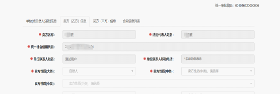 申請(qǐng)人進(jìn)入我是合同的賣(mài)方申報(bào)頁(yè)面,第一張基礎(chǔ)信息表,主要填寫(xiě)申報(bào)單位的信息,填寫(xiě)后這些信息在賣(mài)方(乙方)信息表中不用再次填寫(xiě)?;A(chǔ)表中的聯(lián)系人電話必填,用于接收系統(tǒng)短信,告知申請(qǐng)人辦理進(jìn)入及辦理結(jié)果。第二張賣(mài)方信息表。