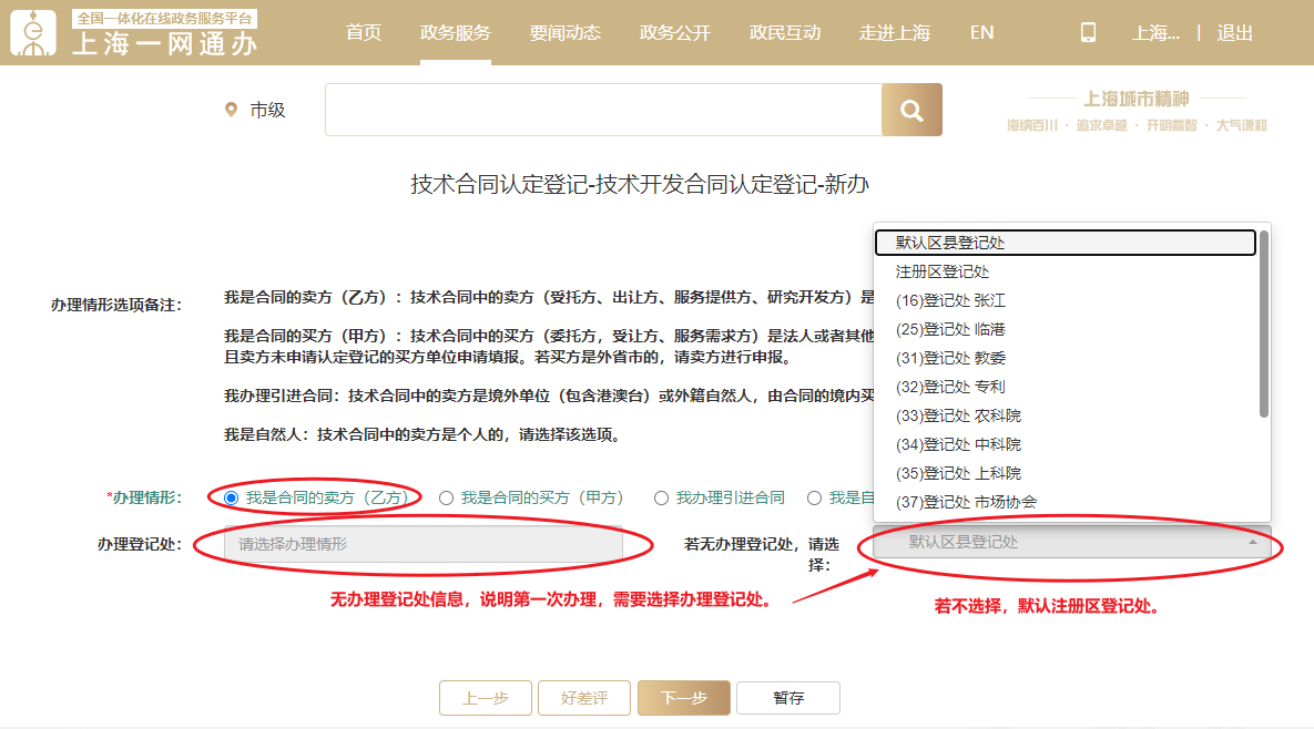 注:第一次辦理的申請(qǐng)人(未申報(bào)過(guò)合同),需要選擇辦理登記處;不做選擇,默認(rèn)注冊(cè)所在區(qū)登記處辦理。