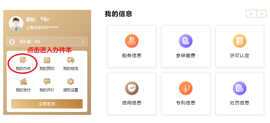 本頁(yè)面左側(cè)點(diǎn)擊“我的辦件”進(jìn)入辦件本。