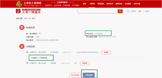 不予受理:登記處對(duì)于該事項(xiàng)給于不予受理的決定。具體原因可點(diǎn)擊“下載通知”按鈕,下載《不予受理通知書(shū)》進(jìn)行查看。