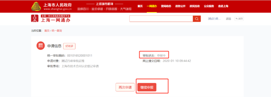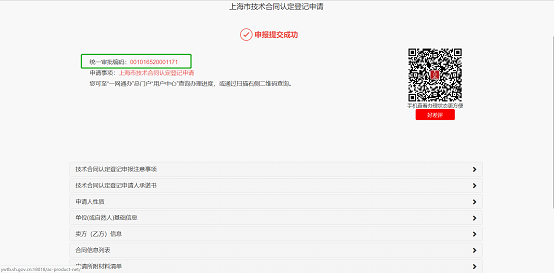 注:請(qǐng)務(wù)必記錄下頁(yè)面右上角的“統(tǒng)一審批編碼”,通過(guò)該編碼可以查詢申報(bào)事項(xiàng)的辦件進(jìn)度及結(jié)果。