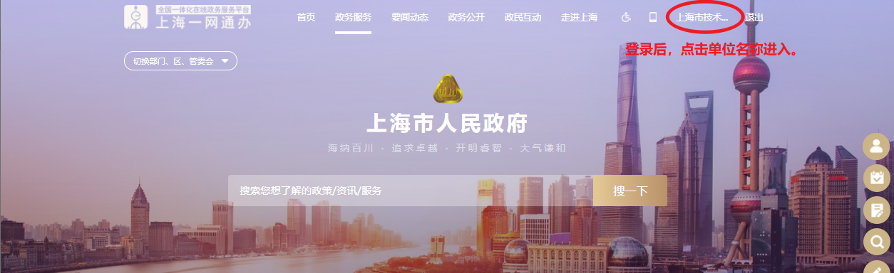 申請(qǐng)人進(jìn)入一網(wǎng)通辦,用戶登錄后,點(diǎn)擊右上角單位名稱進(jìn)入本單位頁(yè)面。