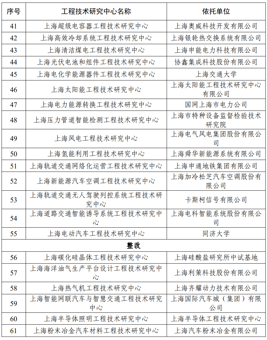 上海鎂材料及應(yīng)用工程技術(shù)研究中心等9家工程中心評(píng)估結(jié)果為“優(yōu)秀”,上海煤基多聯(lián)產(chǎn)工程技術(shù)研究中心等9家工程中心評(píng)估結(jié)果為“良好”,上海航天樹脂基復(fù)合材料工程技術(shù)研究中心等37家工程中心評(píng)估結(jié)果為“一般”,上海碳化硅晶體工程技術(shù)研究中心等6家工程中心評(píng)估結(jié)果為“整改”(具體評(píng)估結(jié)果詳見附件)。