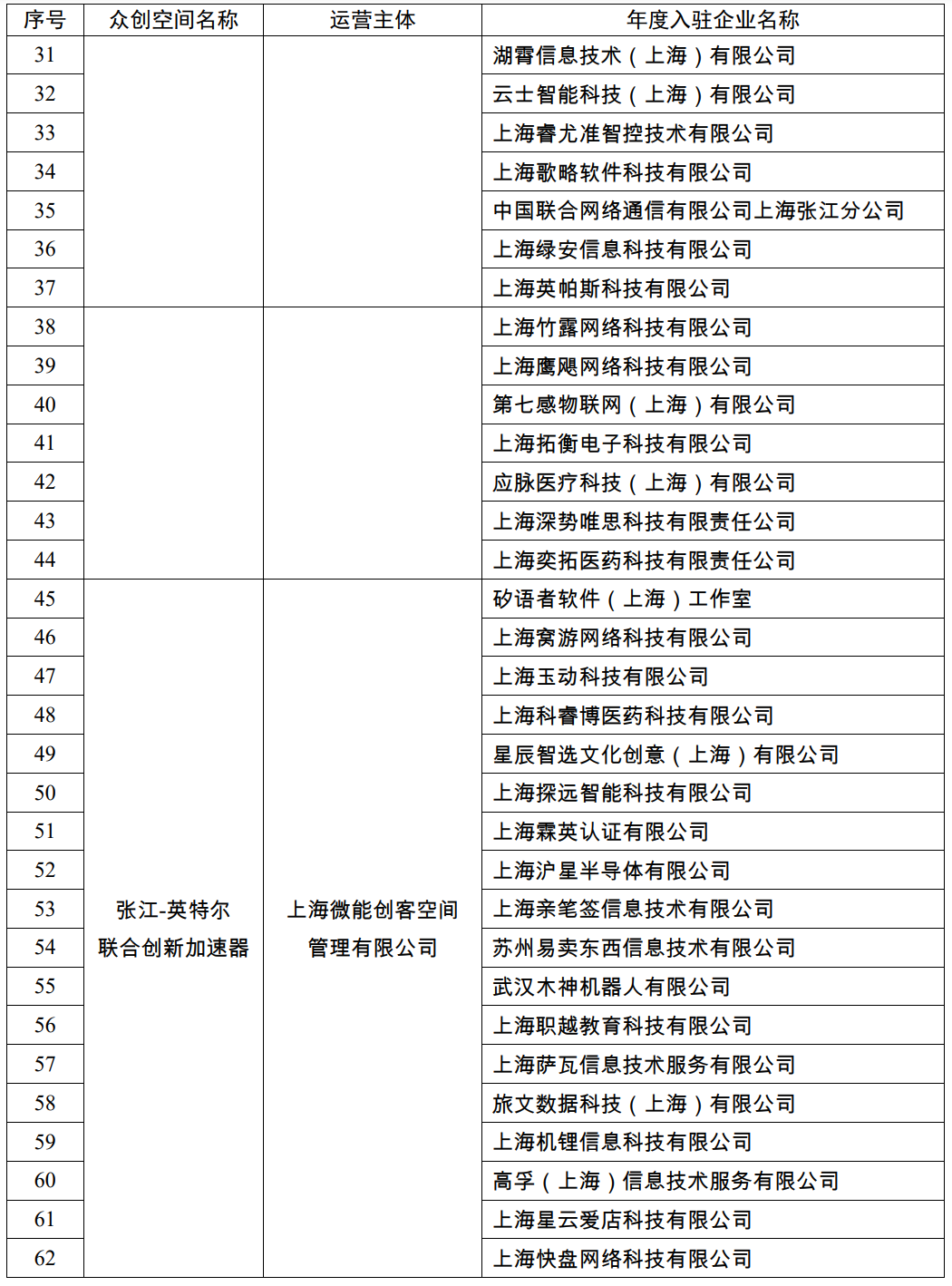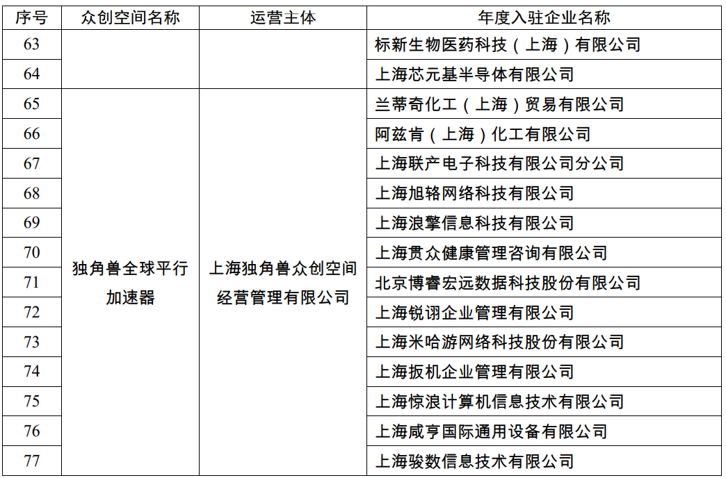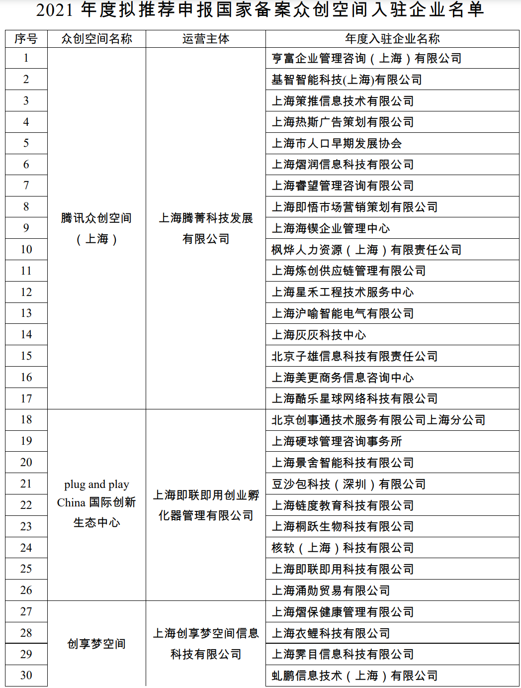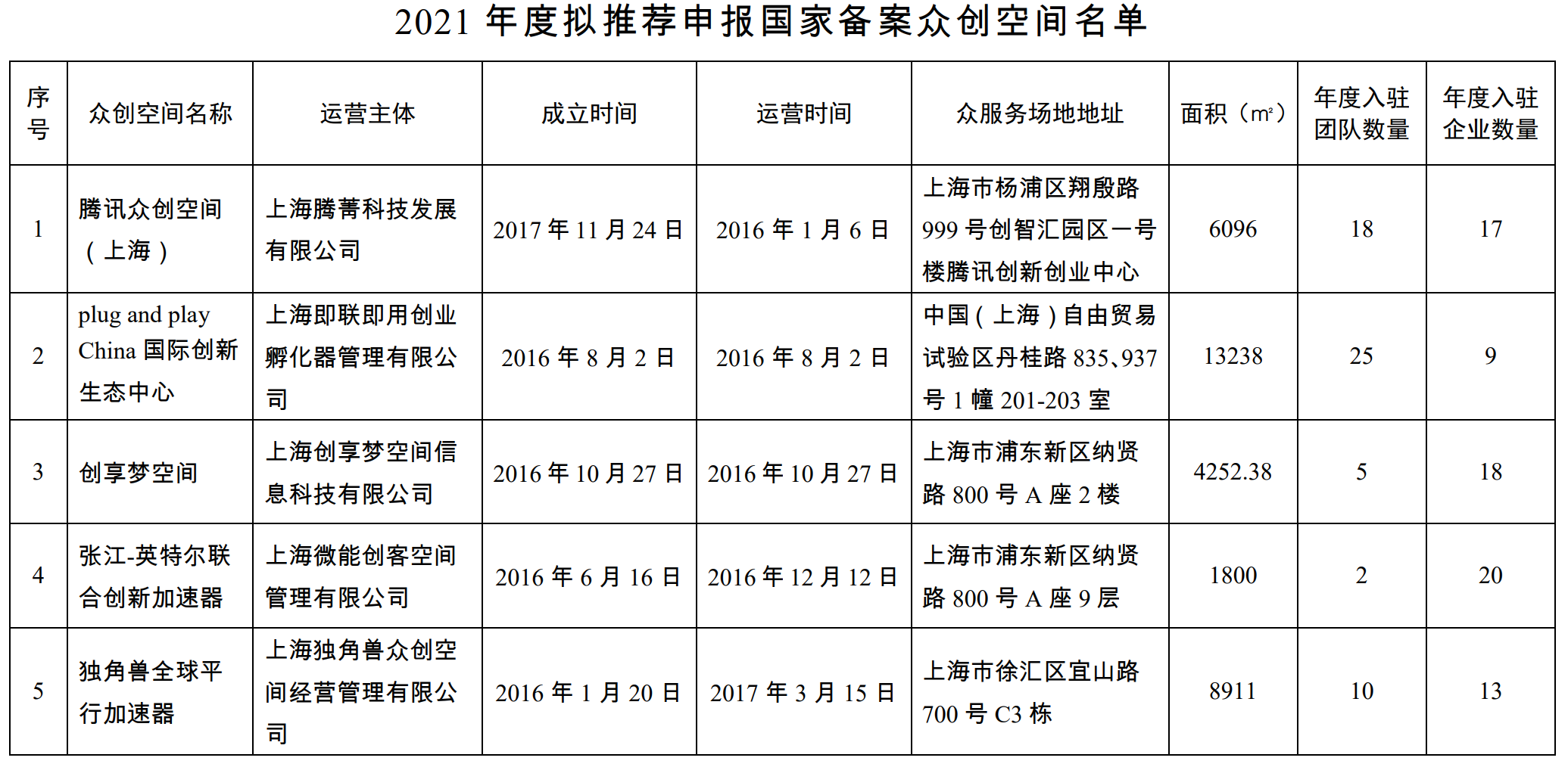 上海市2021年度國家備案眾創(chuàng)空間推薦名單公示的通知