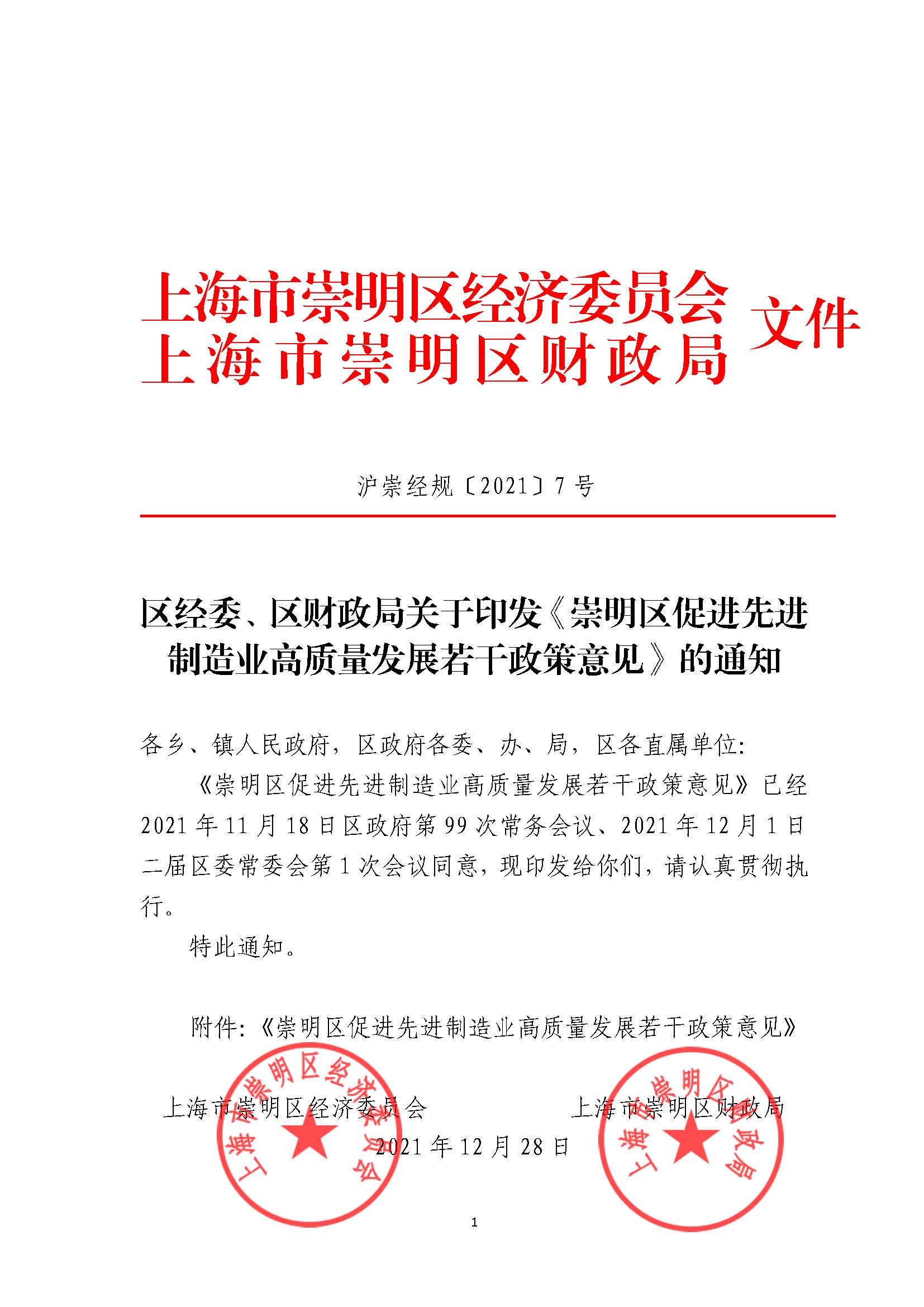 《崇明區(qū)促進(jìn)先進(jìn)制造業(yè)高質(zhì)量發(fā)展若干政策意見》的通知