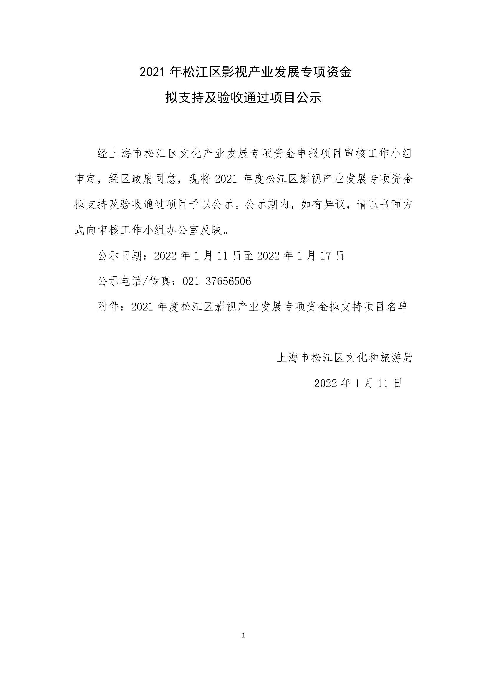 經(jīng)上海市松江區(qū)文化產(chǎn)業(yè)發(fā)展專項(xiàng)資金申報(bào)項(xiàng)目審核工作小組審定,經(jīng)區(qū)政府同意,現(xiàn)將2021年度松江區(qū)影視產(chǎn)業(yè)發(fā)展專項(xiàng)資金擬支持及驗(yàn)收通過項(xiàng)目予以公示。公示期內(nèi),如有異議,請以書面方式向?qū)徍斯ぷ餍〗M辦公室反映。