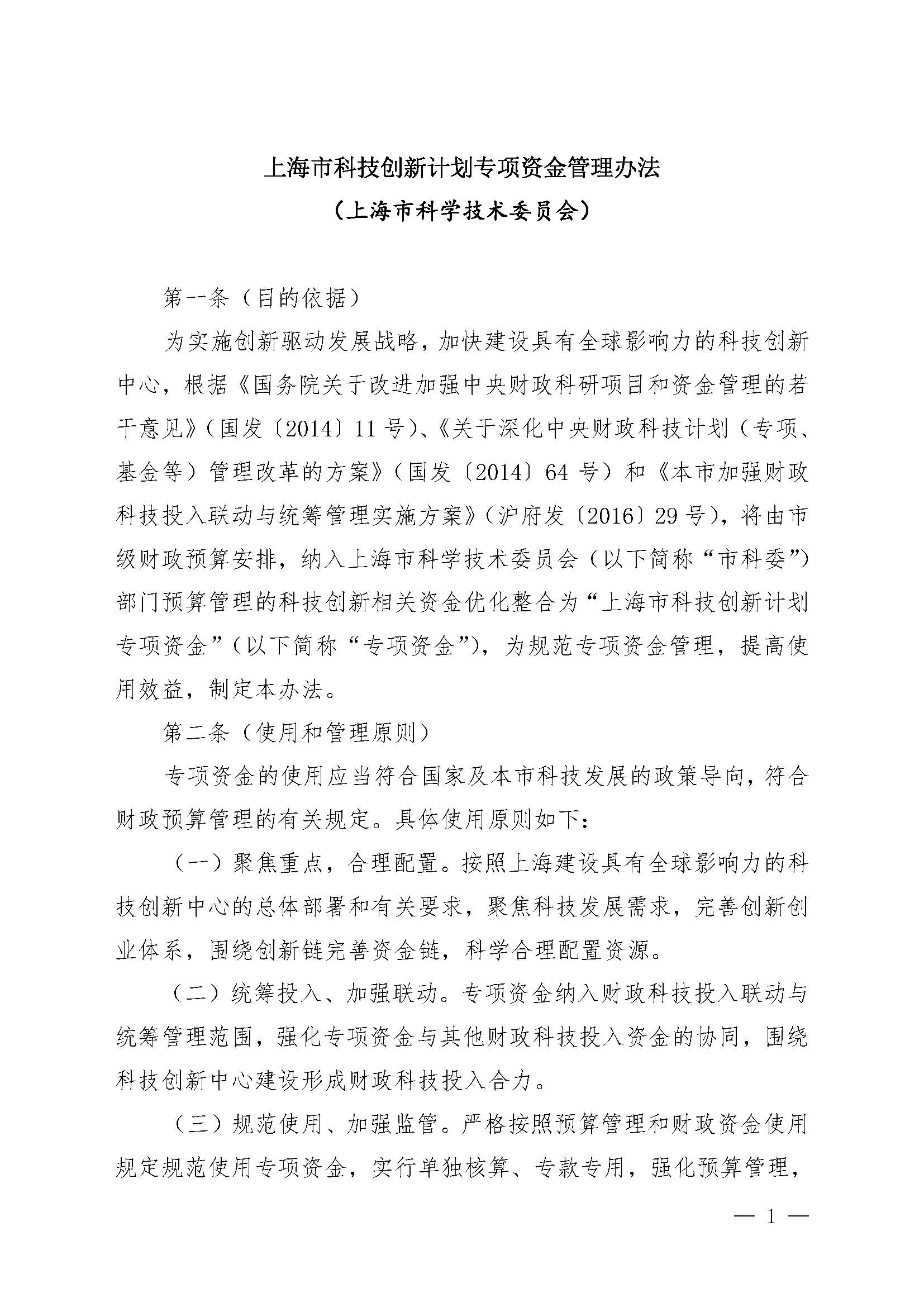 上海市科技創(chuàng)新計(jì)劃專項(xiàng)資金管理辦法
