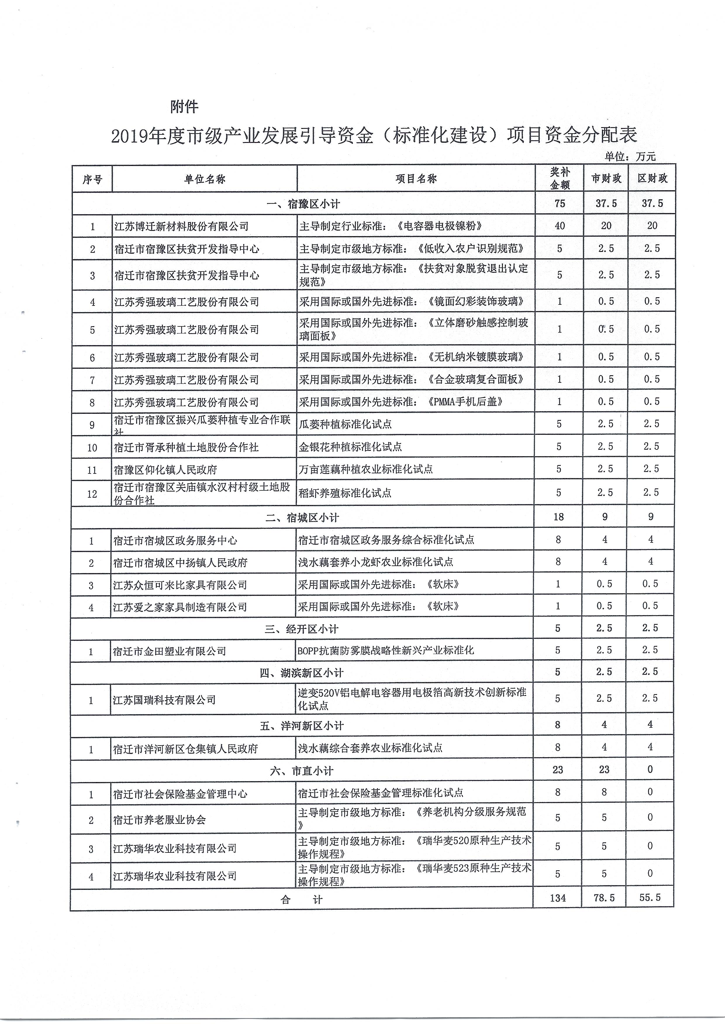 宿遷市關于下達2019年度市級產(chǎn)業(yè)發(fā)展引導資金(標準化建設)項目獎補資金的通知