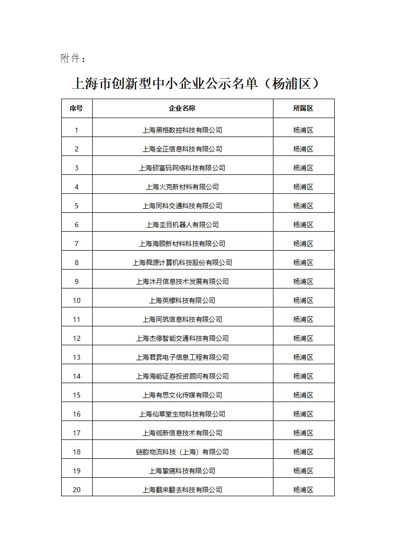 附件:上海市創(chuàng)新型中小企業(yè)公示名單(楊浦區(qū))