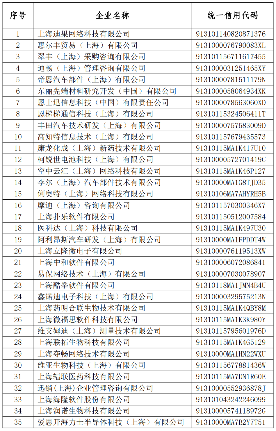 根據(jù)《關(guān)于促進外資增長若干措施的通知》(國發(fā)〔2017〕39號)、《關(guān)于將技術(shù)先進型服務(wù)企業(yè)所得稅政策推廣至全國實施的通知》(財稅〔2017〕79號),《關(guān)于將服務(wù)貿(mào)易創(chuàng)新發(fā)展試點地區(qū)技術(shù)先進型服務(wù)企業(yè)所得稅政策推廣至全國實施的通知》(財稅〔2018〕44號)有關(guān)要求,和《上海市技術(shù)先進型服務(wù)企業(yè)認定管理辦法》(滬科規(guī)〔2019〕4號)有關(guān)要求,經(jīng)合規(guī)性審查,現(xiàn)將上海市2023年度擬認定技術(shù)先進型服務(wù)企業(yè)名單(見附件)予以公示。